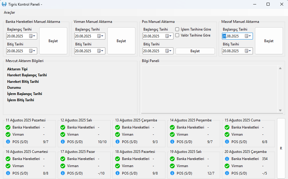 Şuan için Banka Hareketleri, Virman, Pos Satış ve Pos Dönüşleri aktarmaktadır. Kısa zaman içinde Masrafların aktarımına da başlanacaktır.